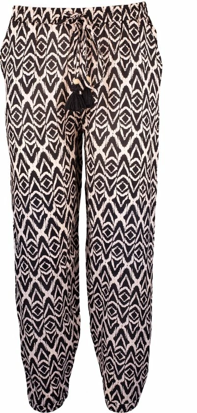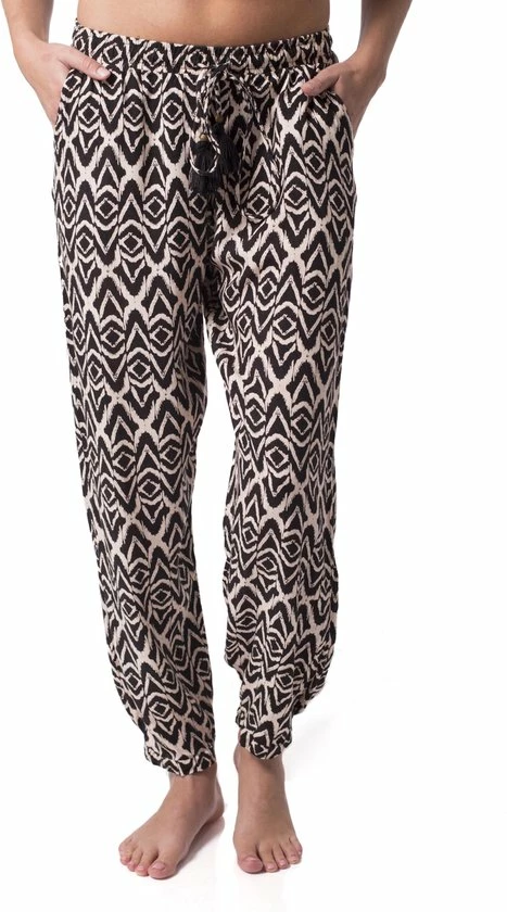 Valt soepel met steekzakken, elastieke band in de taille en enkels en heeft een koordsluiting.