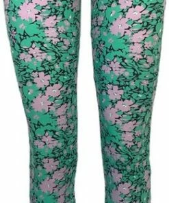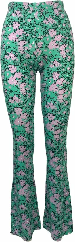 - De broek heeft een all-over bloemenprint in de kleuren paars/groen.