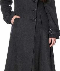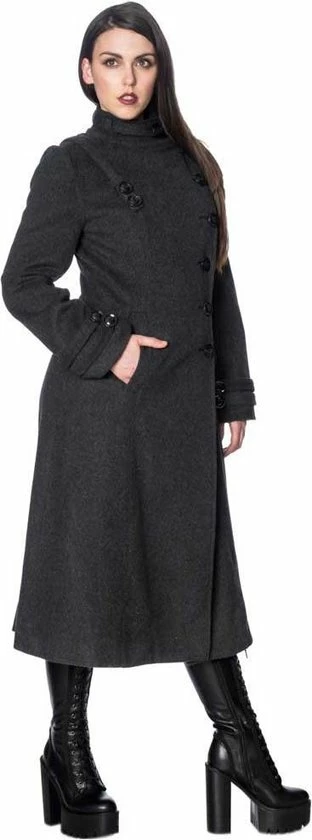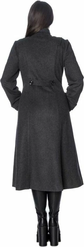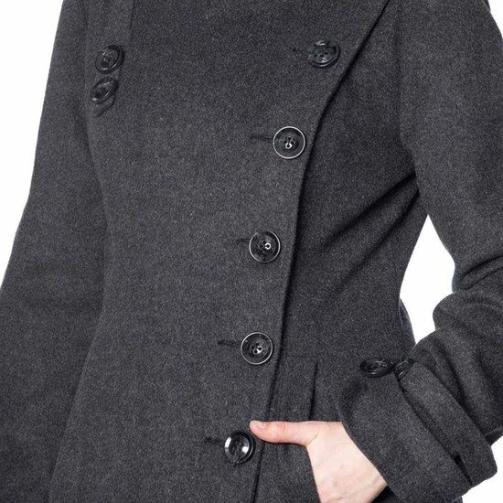Banned. Een grijze dames jas met een omslag knoop sluiting op de voorkant en knoop detail op de mouwen, schouders en achterkant.