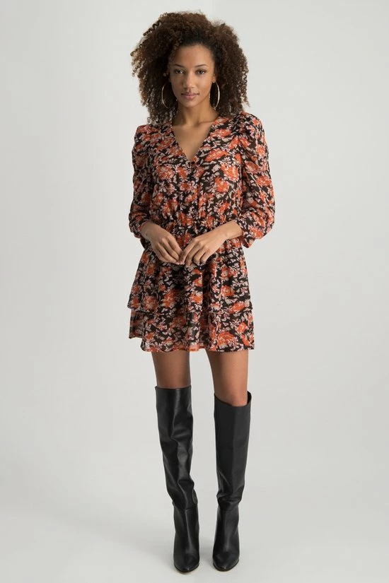 V-hals jurkWijduitlopende fitKorte lengteLange mouwElastieke taillePaisley dessin100% polyester chiffonNon stretch stofBinnenstebuiten machinewas 30°, niet in de droger, strijken of stomen op lichte temperatuur, niet bleken, wassen met gelijke kleurenModel is 1.70m en draagt S