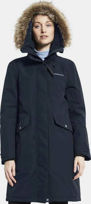Klassieke Didrikson gewatteerde parka met vaste capuchon met afneembaar synthetisch bont voor dagelijks gebruik. Ontworpen voor de persoon die op zoek is naar een sportieve en functionele look., Zacht polyester weefsel met dof oppervlak (katoen touch) Kleur: 060 zwart, 999 Dk nachtblauw, 300 diepgroen – Solution dyed, Regular fit / figuurvormig, WR zijzakken . Reflecterende details: tape op de achterkant van de rechterheup, reflecterende band in de zak. Maak synthetisch bont los.