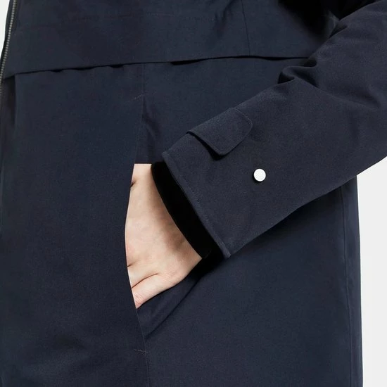 Klassieke Didrikson-parka met vaste capuchon, licht gewatteerd, voor dagelijks gebruik. Ontworpen voor de persoon die houdt van een vrouwelijke vorm met gemiddelde breedte over de taille., Zacht polyester weefsel met dof oppervlak (katoen touch) Kleur: 060 Zwart, 999 Dk Nachtblauw, 300 Diepgroen – Solution dyed, Regular fit /Figuur gevormd, licht achtergrond, juk onder de borst en aan de achterkant met metalen klinknagels.