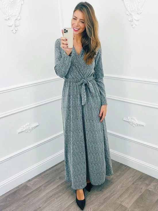Oelala.. Deze jurk is er echt een die niet mag ontbreken in jouw kast 😉 Mooie Maxi Lengte en een mooie lange mouw. De jurk heeft een overslag bij de boezem en verder is de rok helemaal gesloten. In de taille zit een elastiek en een bijpassend ceintuur waarmee je de jurk helemaal naar wens kunt strikken. LOVE IT!