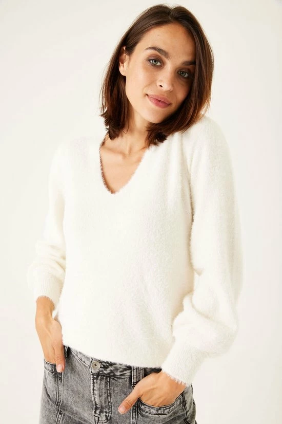 Fluffy, gebreide trui. Deze trui heeft een V-hals, subtiele ballonmouwen en een regular fit. Dit item is gemaakt van 72% polyamide, 18% viscose en 10% polyester.