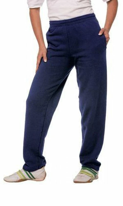 Donkerblauwe joggingbroek met open/rechte pijpen/straight leg. Unisex model klassieke joggingbroek met zeer comfortabele pasvorm. Materiaal: 80% katoen/20% polyester. Lengte binnen maat: S 79, M 80, L, 81, XL, 82 cm. Buiten maat: S 106, M 108, L 110, XL 112 cm. Sportbroek/trainingsbroek voor volwassenen.
