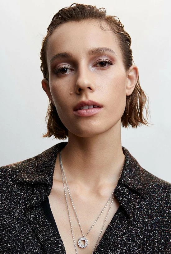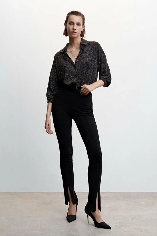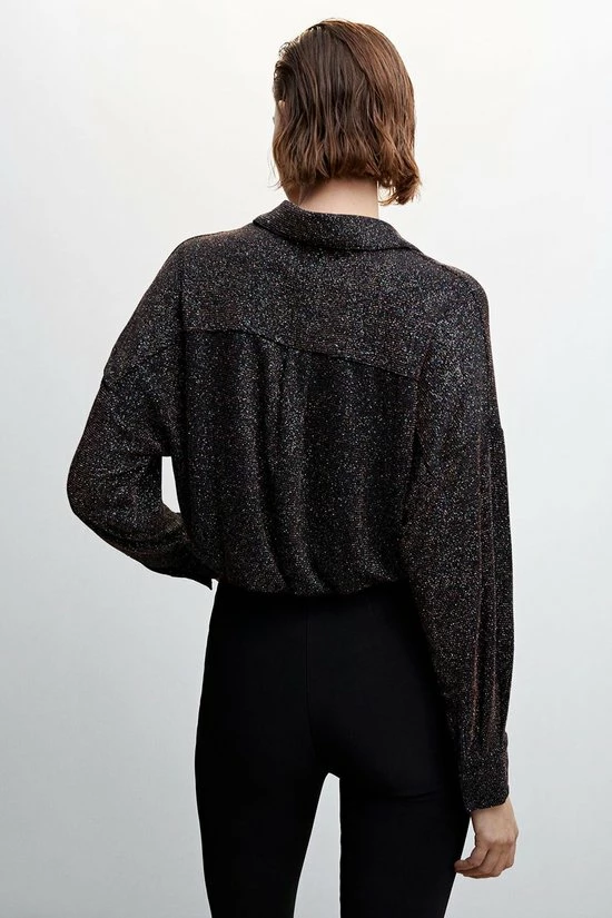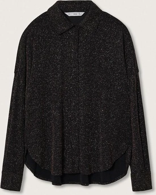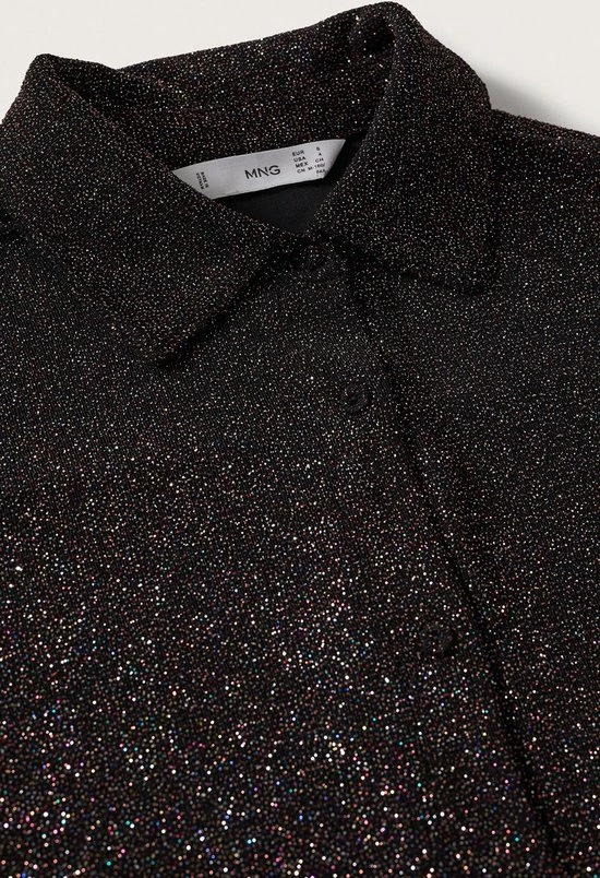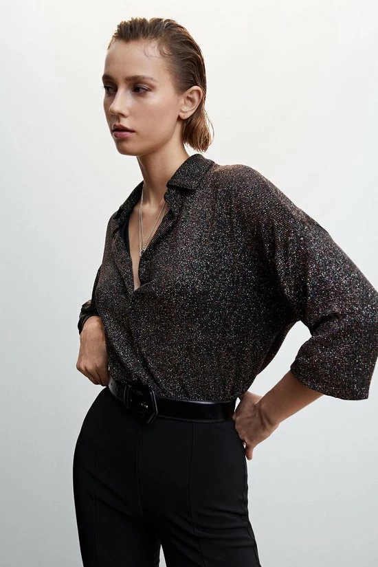 Glitterblouse van Mango met lange mouwen en een puntkraag. De blouse sluit met beklede knopen.