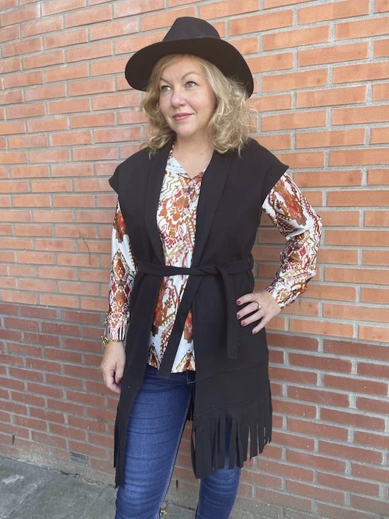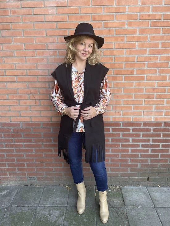 Wat is ie leuk!! Dit lange gilet met een tailleband en franje onderlangs. Helemaal in de ‘country style’ en ook leuk om te combineren met cowboylaarzen, die helemaal hot zijn op dit moment.