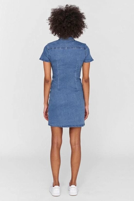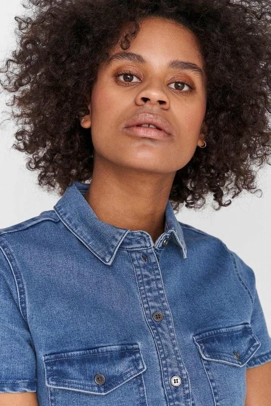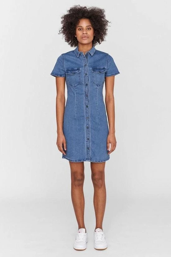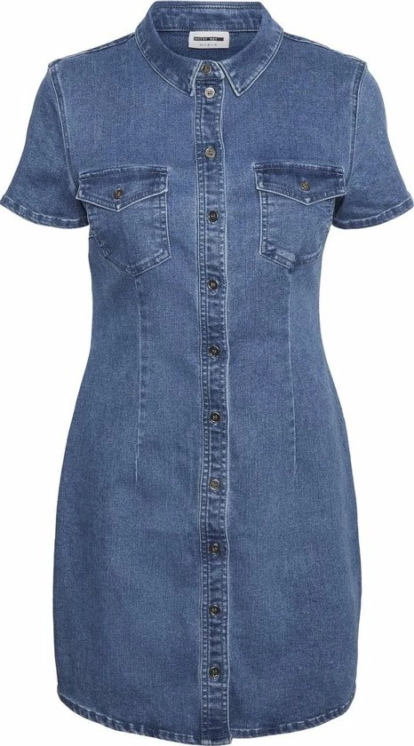 NOISY MAY medium blauwe denim, korte jurk met knoopsluiting. Het jurkje valt aangesloten en heeft een stoere washed look. De jurk heeft extra comfort vanwege de stretch. Het is gemaakt van 71% katoen, 24% polyester, 3% viscose en 2% elastaan.