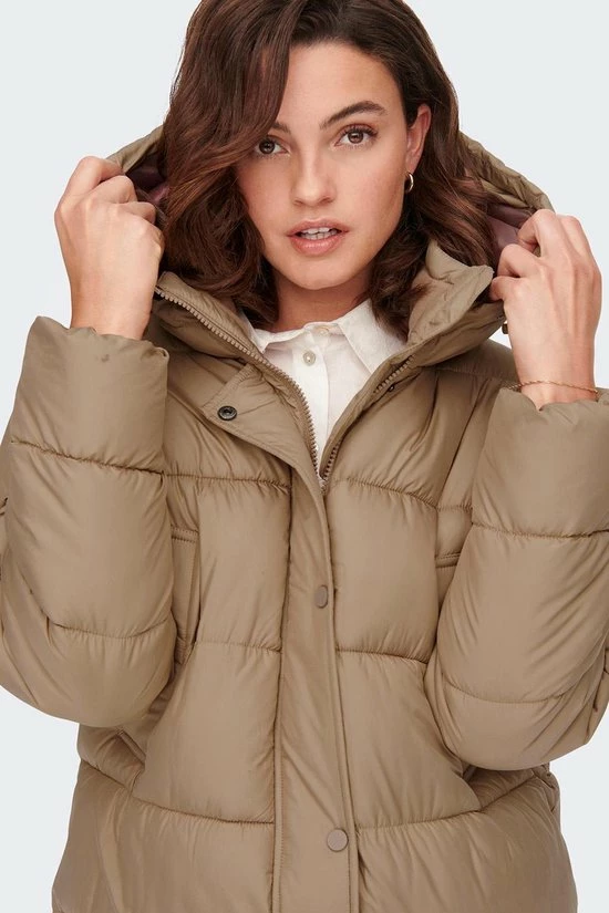 Lange winterjas van Only met lange mouwen en een vaste capuchon. De jas heeft schuin geplaatste steekzakken op borsthoogte en sluit met een drukknoop – ritssluiting. Onder aan de zijkant bevinden zich enkele drukknopen voor meer bewegingsvrijheid.