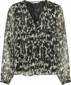 Semi-transparante blouse van Only met een army patroon. De lange mouwen hebben een elastische zoom. De blouse heeft een V-hals met knopen hieronder.