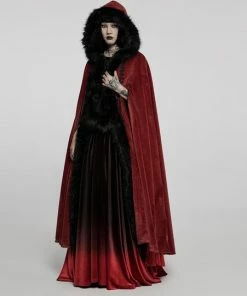 Punk Rave. Gothic Tales – Victoriaanse gotische rode mantel van imitatiebont voor dames met capuchon.