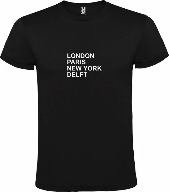 Roly Zwart T-Shirt Met “ LONDON, PARIS, NEW YORK, DELFT “ Afbeelding Wit Size L