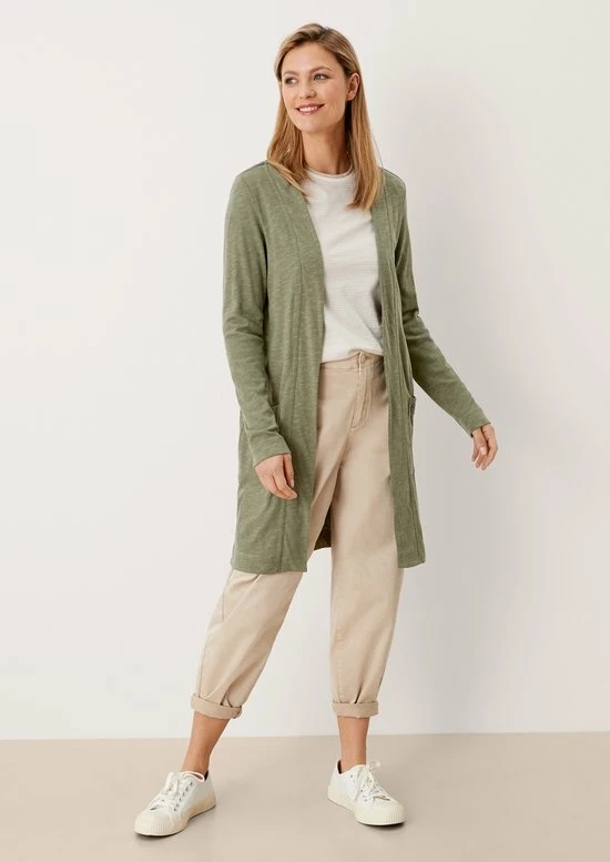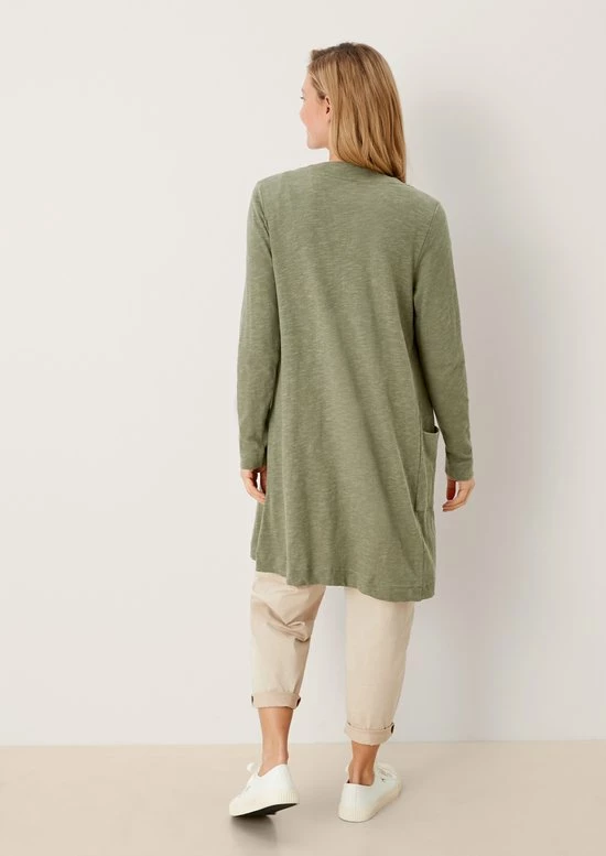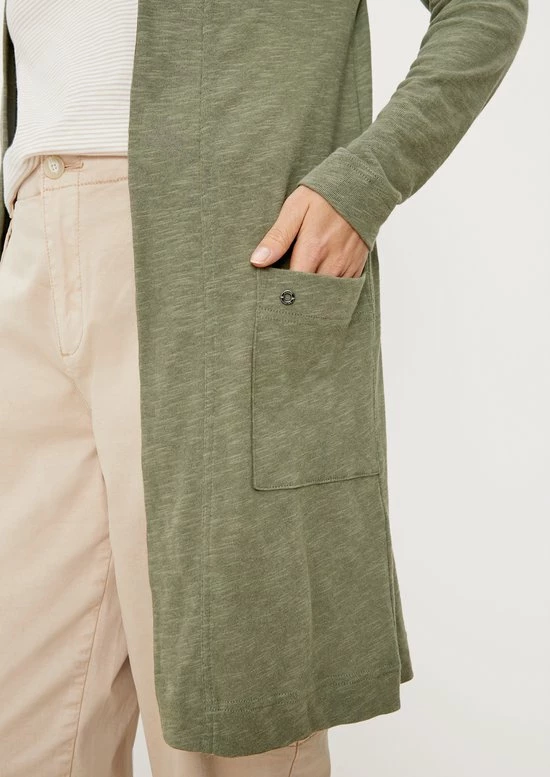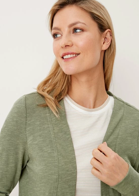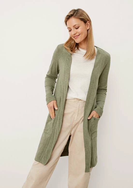 Vest met lange mouwen. Voorzien van twee steekzakken; geen sluiting. Gemaakt van een fijne materiaalmix met katoen, polyester en viscose.