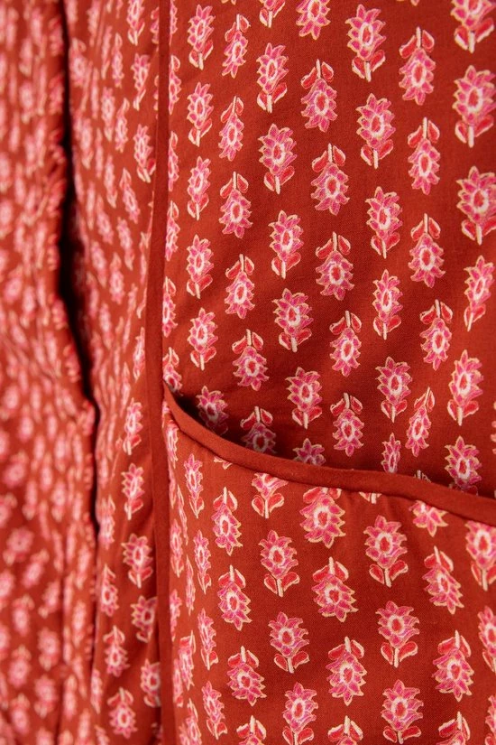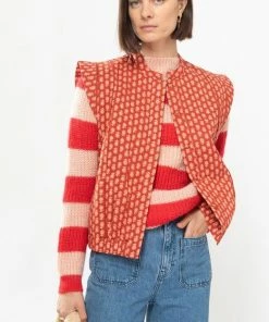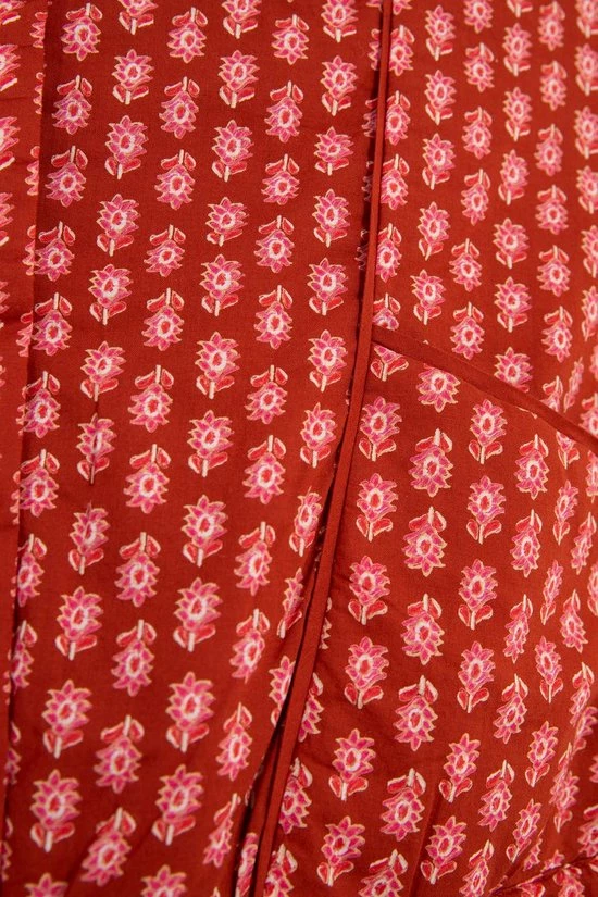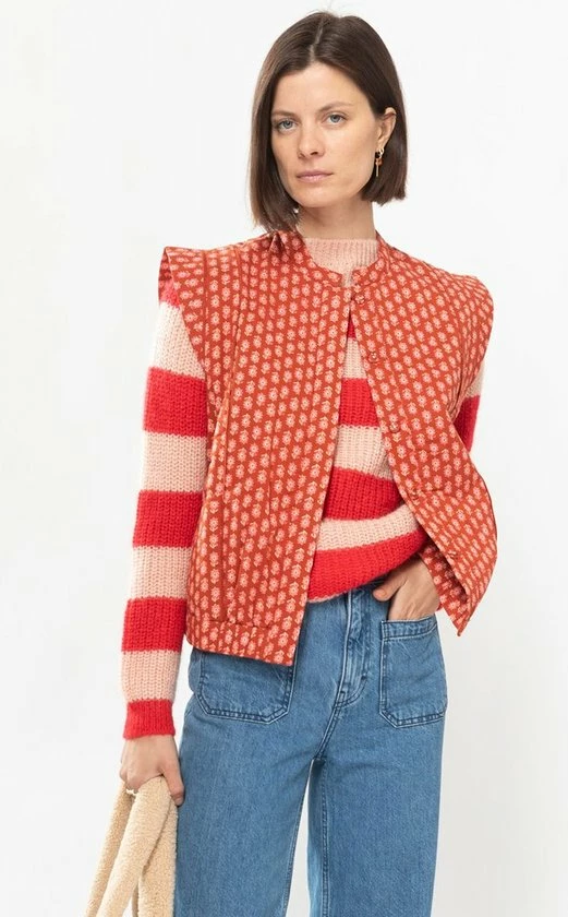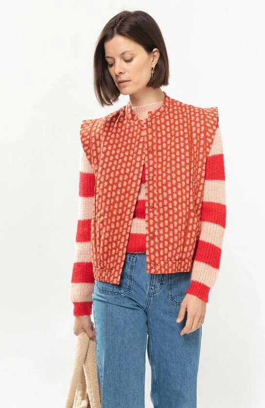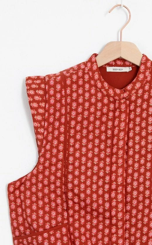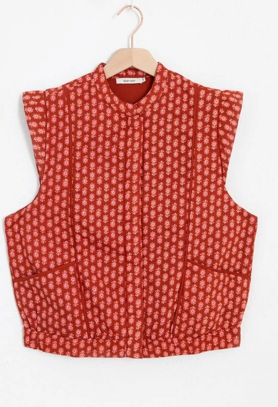 Met een mooie gilet geef jij je outfit snel een persoonlijke draai. Deze donkerrode waistcoat van Sissy-Boy is padded en heeft een minimalistische indiaanse bloemenprint. Hij is mouwloos en een heeft een schouder detail. De waistcoat is gemaakt van 100% katoen.