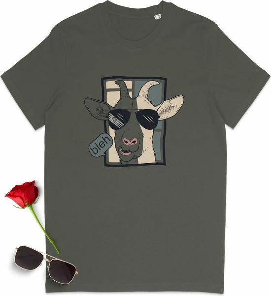 Stanley/Stella Grappig T Shirt Met Cartoon Geit – Dames T Shirt Met Print – Heren T Shirt Met Opdruk – Unisex Maten: S M L XL XXL XXXL – Tshirt Kleuren: Wit Khaki.