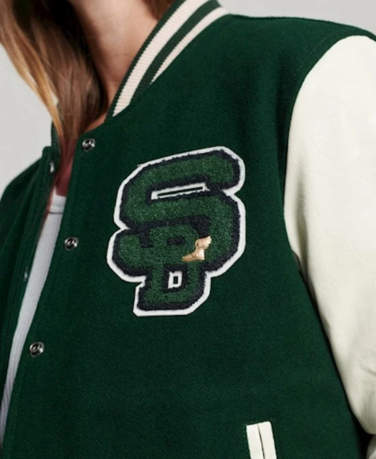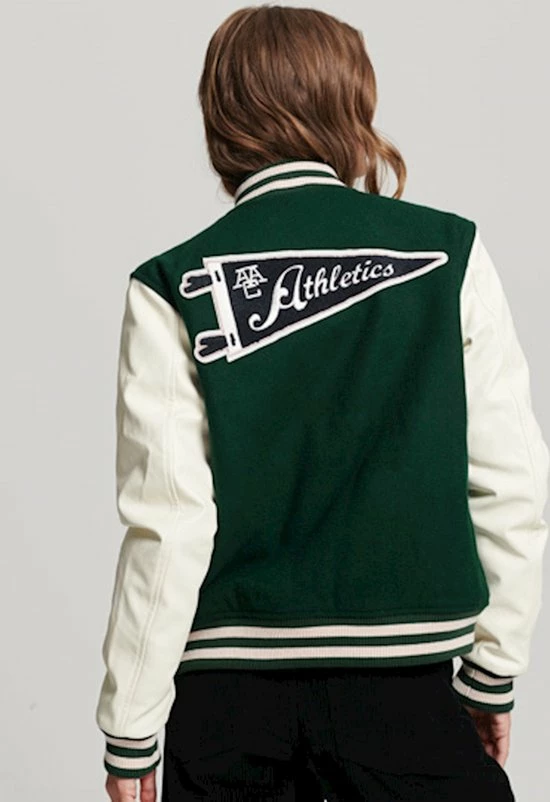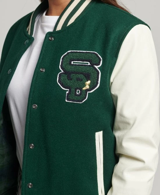 Bij Superdry laten we ons voortdurend inspireren door alles wat met Americana te maken heeft. Daarom zijn varsity-jacks een van onze iconische must-haves. Ons Varsity Patched-bomberjack is een liefdevol herontwerp van deze stijl en bevat alle authentieke stijldetails om je die klassieke look te geven. Deze jas is tot in perfectie verfijnd en heeft opvallende patches, zodat je een retro-college look kunt creëren en je vintage look naar een hoger niveau kunt tillen. Combineer het jack met een geruit overhemd voor een perfecte stijl, of met je vertrouwde jeans om je look casual, maar toch klassiek te houden. Ontspannen pasvorm – de klassieke Superdry-pasvorm. Niet te nauwsluitend, niet te ruim, precies goed. Kies je gebruikelijke maat, Rijke wolmix, Gestreepte en geribde kraag en boorden, Drukknoopsluiting, Varsity patch, Twee zakken met drukknopen, Geruite voering, Geborduurd Superdry-logo.