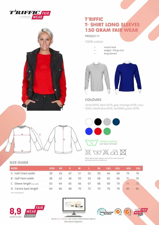 Dit T-shirt van het merk T’riffic is gemaakt van 80% katoen en 20% polyester. Het T-shirt heeft een ronde hals en is beschikbaar in verschillende kleuren waardoor er altijd wel iets van uw smaak bij zit. T’riffic is ‘leader’ op het gebied van sociaal duurzaam produceren. De categorie ‘leader’ wordt bepaald door Fair Wear Foundation.