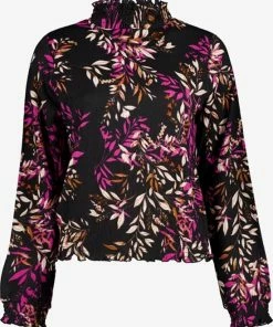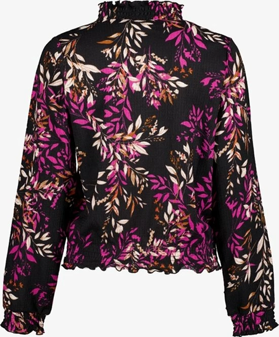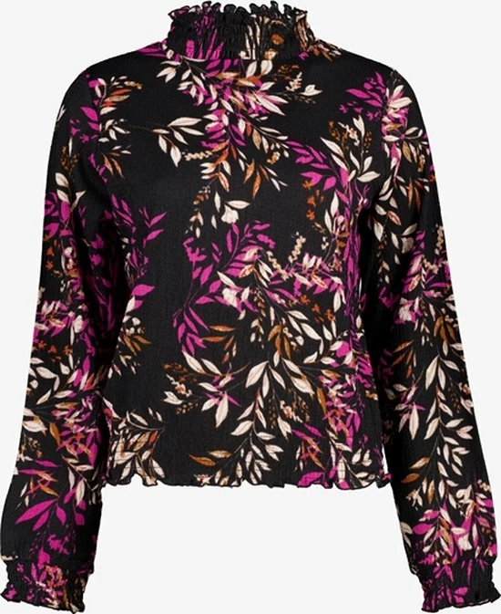 Zwarte dames smock top uit de TwoDay collectie. De top heeft een gesmockte, hoge kraag en gesmockte details bij de mouwen. De top is voorzien van een all over roze bloemenprint. Gemaakt van 98% polyester en 2% elastaan.