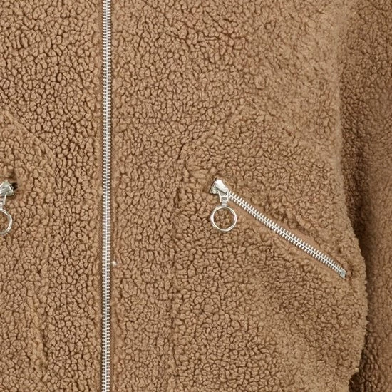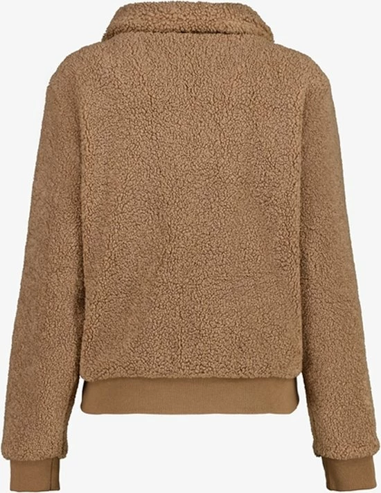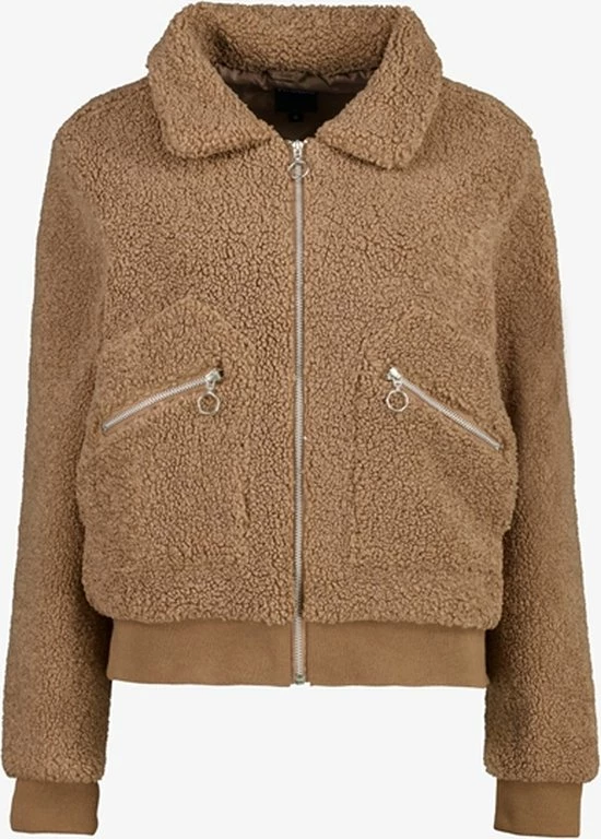 Bruine teddy jas voor dames. Voorzien van een ritssluiting, omgeslagen kraagje en elastische boorden. De korte teddy jas heeft twee zakken met ritsen en is gemaakt van 100% polyester.