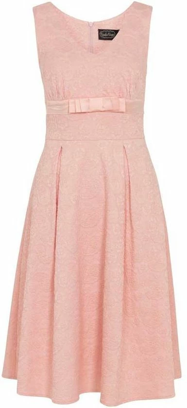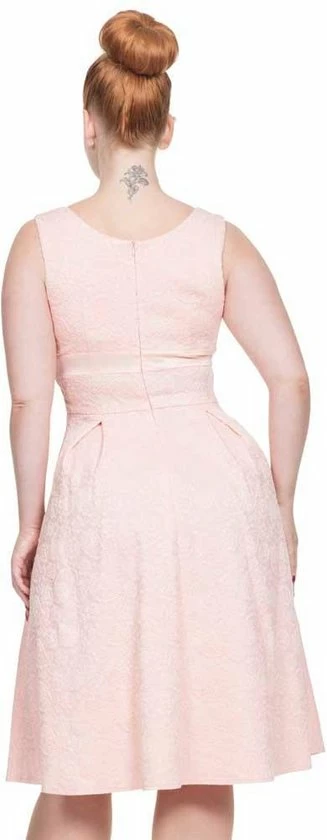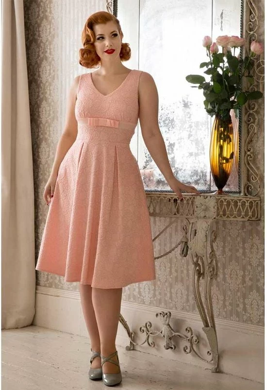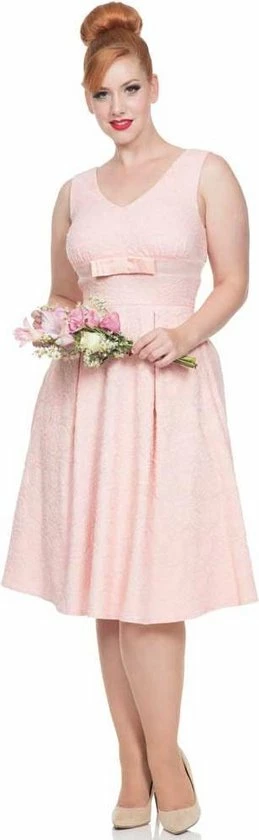 Voodoo Vixen. Een mooie swing trouw jurk. Trouwen is een mooie gebeurtenis, en je outfit moet dat uiteraard ook zijn. We willen dat iedereen zich als een vintage queen voelt op haar grote dag en met deze jurk zal je dat zeker zijn. Dit is een prachtige elegante trouw jurk gemaakt van materiaal met een gebloemd kanten textuur, met een V-halslijn en een geplooide buste.