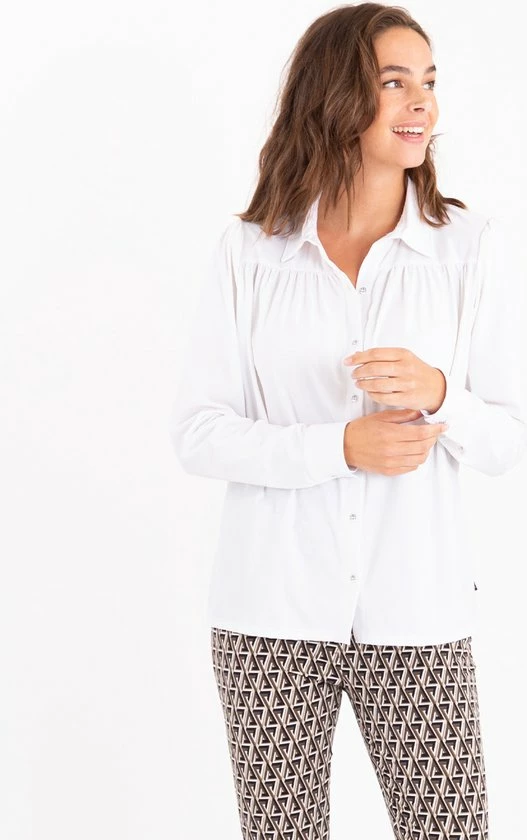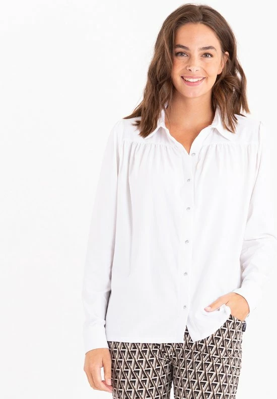 Ben je gek op kleding die fijn draagt, maar ook mooi blijft de hele dag? Dan is deze Travel kwaliteit jouw kwaliteit! Kreukt nauwelijks, veel draagcomfort! Lees hier alles () over Travel kwaliteit.• Heerlijke blouse in fijne travel quality• Sierknoopjes • Manchetten oprolbaar • Vrouwelijke plooitjes bij de schouders en borst